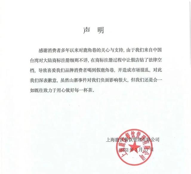 由于品牌来自中国台湾,对大陆商标注册细则不详,在商标注册过程中让假店钻了法律空子,导致喜爱我们品牌的消费者喝到假鹿角巷,并造成市场混乱,对此我们深表歉意。