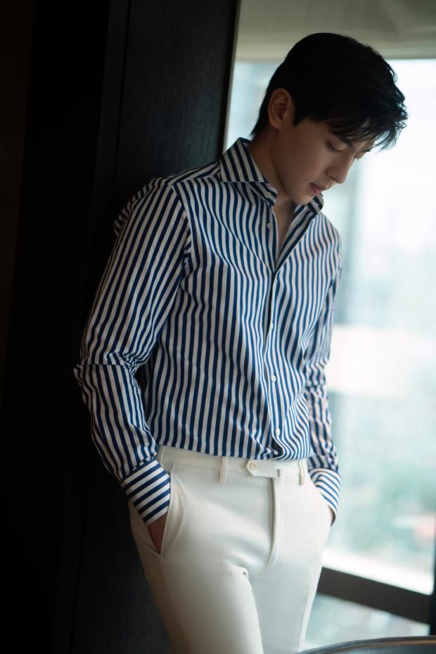 条纹元素并不少见,与纯色系单品结合,会迸发出独特时尚效果,看起来简约但不会太单调,视觉效果饱满,但又不会显得太凌乱,是一种很受欢迎的搭配公式。这次邓伦就穿着一件黑白条纹衬衣出镜,搭配纯白色西装长裤,就显得颇为干练大气;黑白条纹简约大方,将衣摆收进裤腰里,下面搭配白色西装长裤,整体look也很有魅力。