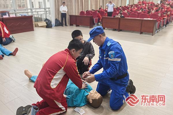 上杭县公益救援协会的志愿者们现场示范了救生衣的规范穿戴步骤,细致讲解了穿戴过程中的注意事项,用模拟道具演示了溺水者抢救的关键流程,包括清除口鼻异物、心肺复苏基础动作等核心技能。6名学生代表踊跃上台,在志愿者的指导下亲身体验救生衣穿戴和模拟心肺复苏操作,志愿者逐一纠正不规范动作,确保学生们掌握正确方法。“原来救生衣的带子要系紧才有效”“心肺复苏的按压力度要适中”,亲身体验让学生们对急救技能有了更直观的理解。